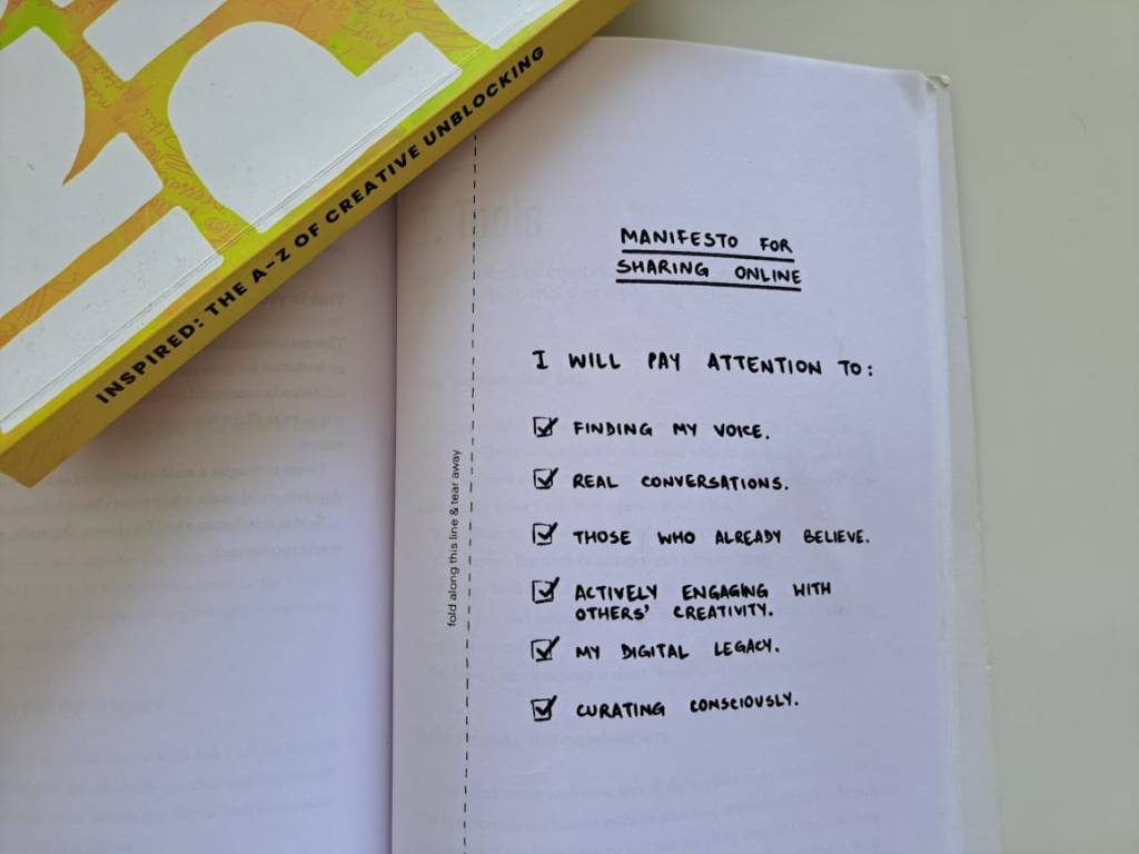 My social media sabbatical comes many months after I’d published my “Manifesto for Sharing Online” in my book Inspired: The A-Z of Creative Unblocking. This manifesto was detailed out in the chapter on social media and was aimed at reducing the frustration that comes with being a content-creator (no matter how small your audience may be).