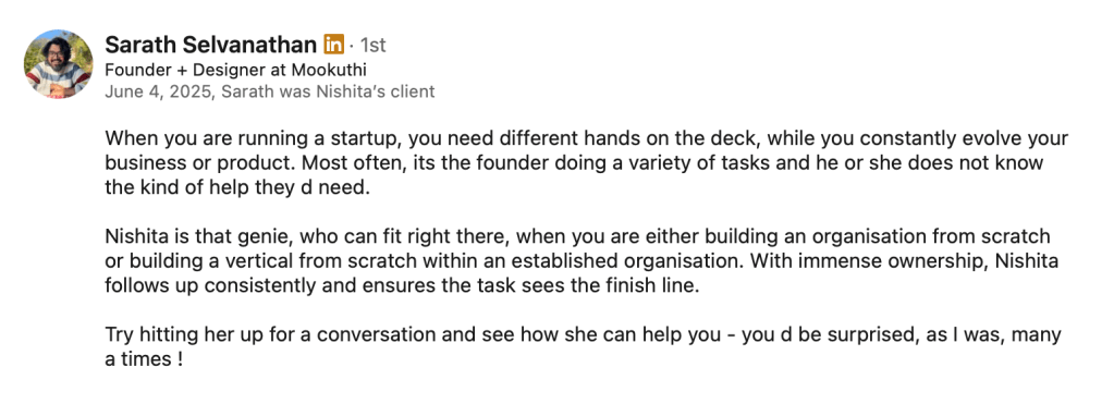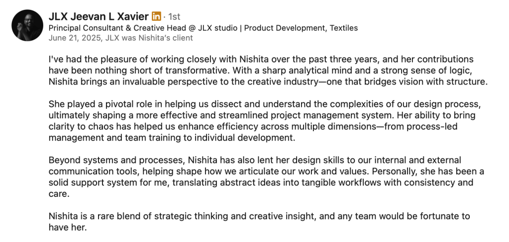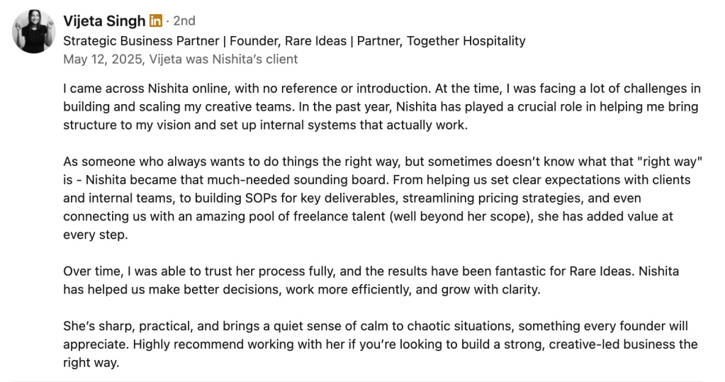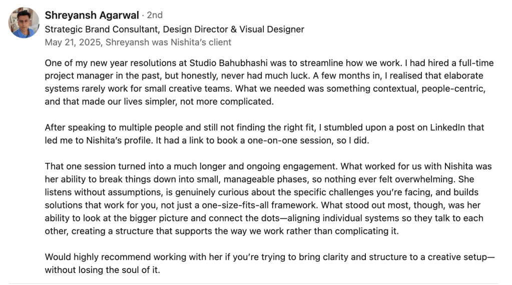 In 2020, I joined a brand design studio I deeply admired — not as a designer, but as a Project Manager. I wanted to fix that gap between creative talent and operational support. That’s been my focus for over five and a half years now. I started in-house and now work independently with several studios at once.